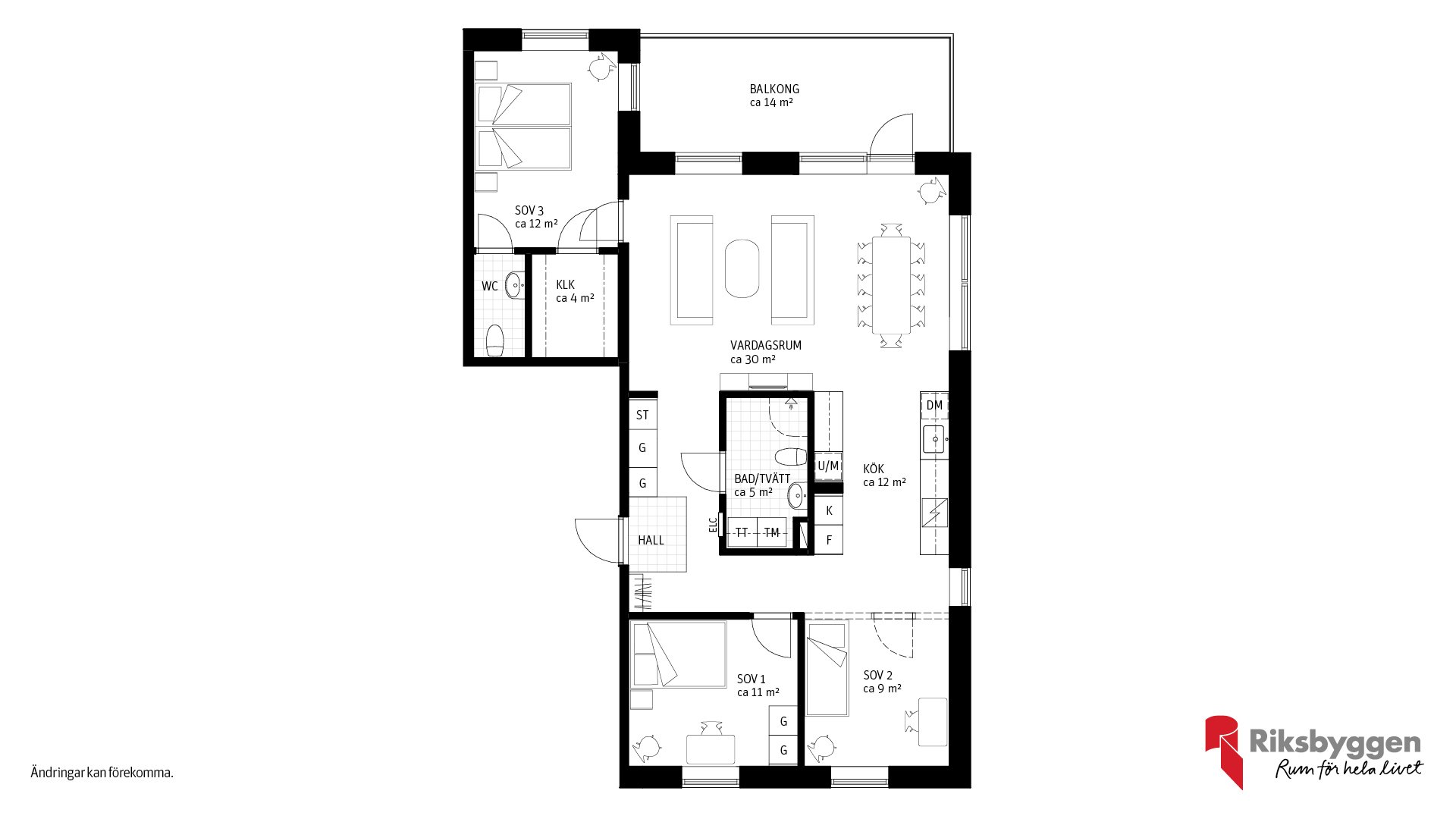 Här har vi tänkt till för att ge dig ett hem som passar just din livsstil. För dig som vill ha extra rymd och sociala ytor finns möjlighet att välja bort vissa innerväggar – till exempel mellan sovrum och vardagsrum – och i stället få ett större, öppnare vardagsrum. Det är ett perfekt alternativ för dig som prioriterar kvadratmetrar och ljus framför antal rum.