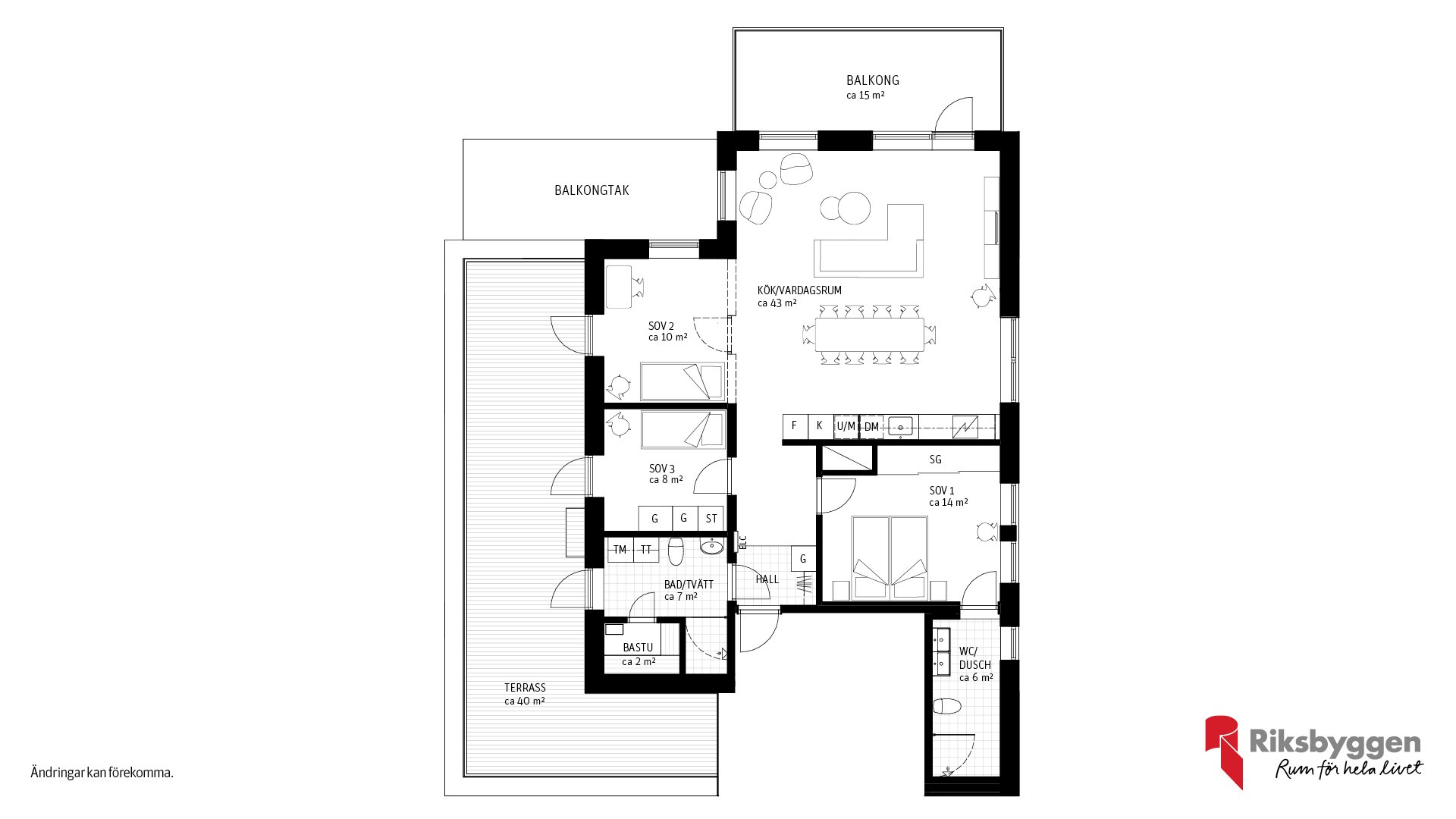 Här har vi tänkt till för att ge dig ett hem som passar just din livsstil. För dig som vill ha extra rymd och sociala ytor finns möjlighet att välja bort vissa innerväggar – till exempel mellan sovrum och vardagsrum – och i stället få ett större, öppnare vardagsrum. Det är ett perfekt alternativ för dig som prioriterar kvadratmetrar och ljus framför antal rum.