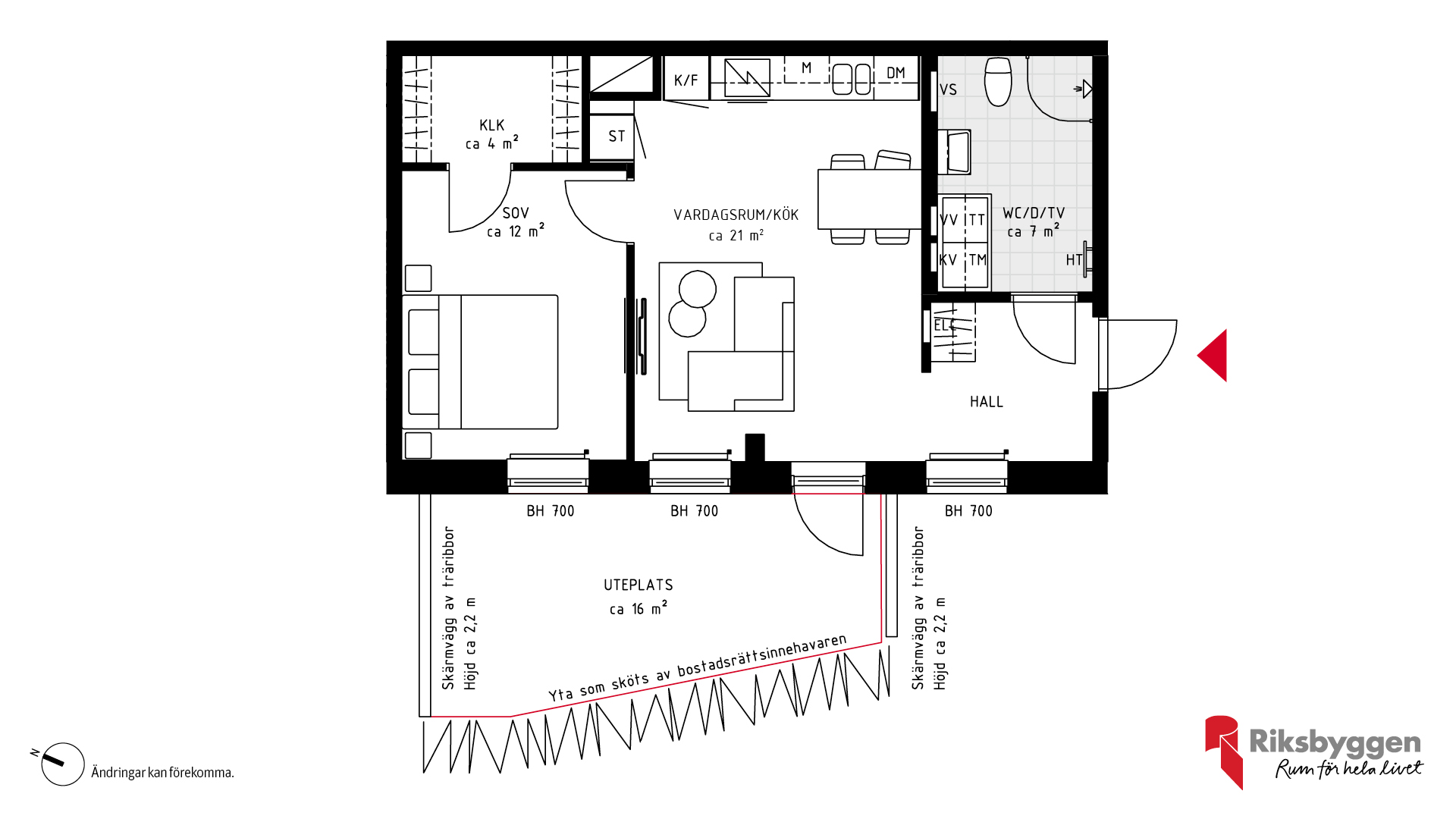 Två rum och kök med öppen planlösning mellan kök och vardagsrum, master bedroom med stor anslutande klädkammare. Generös uteplats direkt mot den gröna, lugna innergården.