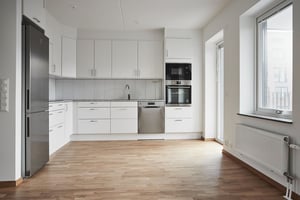 Socialt planerad lägenhet med kök, matplats och vardagsrum i öppen planlösning och utgång till balkong med utsikt mot den lugna innergården. Helkaklat badrum och generöst master bedroom med flera garderober.
