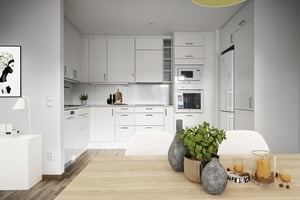 Inbyggnadsugn och mikro i högskåp, (ej 1 rum och kök) induktionshäll, kyl och frys alternativt kyl/frys, diskmaskin.