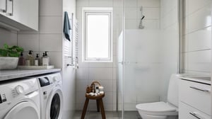 Klinker på golvet och kaklade väggar. Tvättställ med kommod. Spegelskåp med belysning. Skåp med förvaring. Duschhörn och handduksvärmare. Tvättmaskin och torktumlare alternativt kombimaskin.