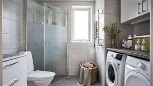 Klinker på golvet och kaklade väggar. Tvättställ med kommod. Spegelskåp med belysning. Skåp med förvaring. Duschhörn och handduksvärmare. Tvättmaskin och torktumlare alternativt kombimaskin.