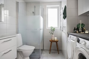 Klinker på golvet och kaklade väggar. Tvättställ med kommod. Spegelskåp med belysning. Skåp med förvaring. Duschhörn och handduksvärmare. Tvättmaskin och torktumlare.