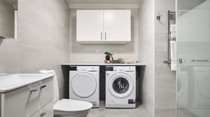 Klinker på golvet och kaklade väggar. Tvättställ med kommod. Spegelskåp med belysning. Skåp med förvaring. Duschhörn och handduksvärmare. Tvättmaskin och torktumlare alternativt kombimaskin.