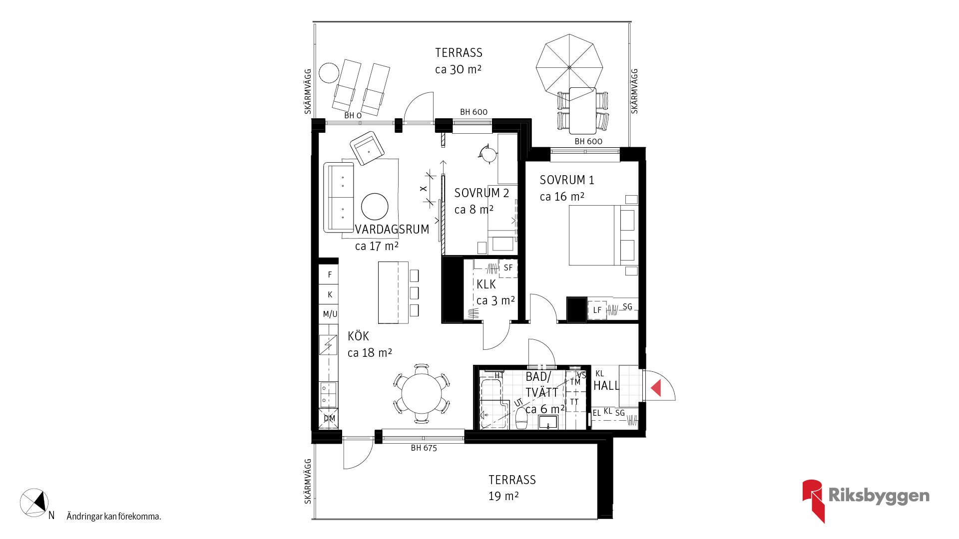 Väldisponerad 3:a med två stora terrasser åt två väderstreck. Öppen planlösning mellan matplats, kök och vardagsrum. Kök med köksö för maximal köksförvaring och perfekt yta för matlagning tillsammans. Sovrum med skjutdörrsgarderob. Klädkammare. Sovrum med utsikt mot park. Badrum med möjlighet att göra tillval på badkar.