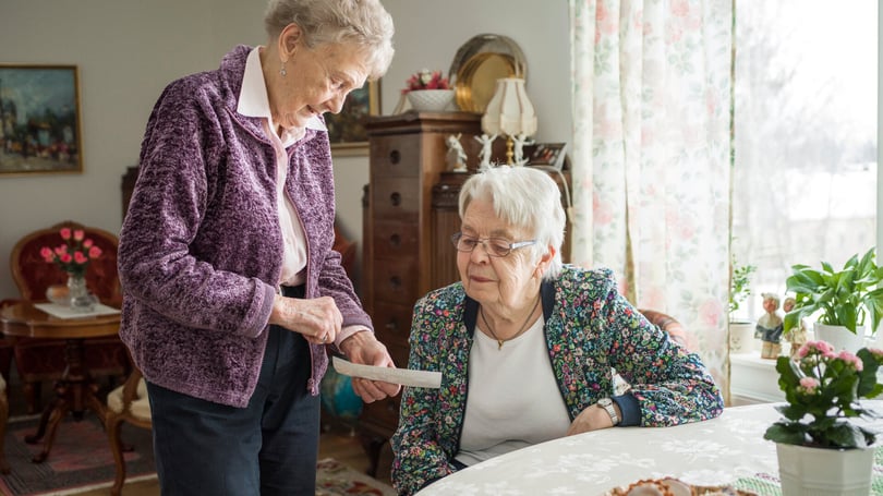 Två äldre kvinnor spelar brädspel vid ett bord i ett vardagsrum