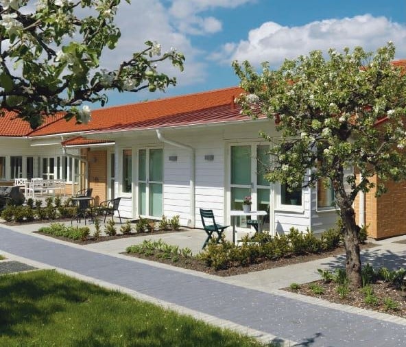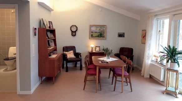 En viktig del är att ha sin egna möblerade lägenhet. Kombinationen av den privata bostaden och de gemensamma, anpassade utrymmena både inomhus och utomhus, ger såväl rörelsefrihet som valfrihet. Samtidigt har de boende tillgång till trygghet och hjälp av personal och undersköterskor dygnet runt. I den mån de önskar.