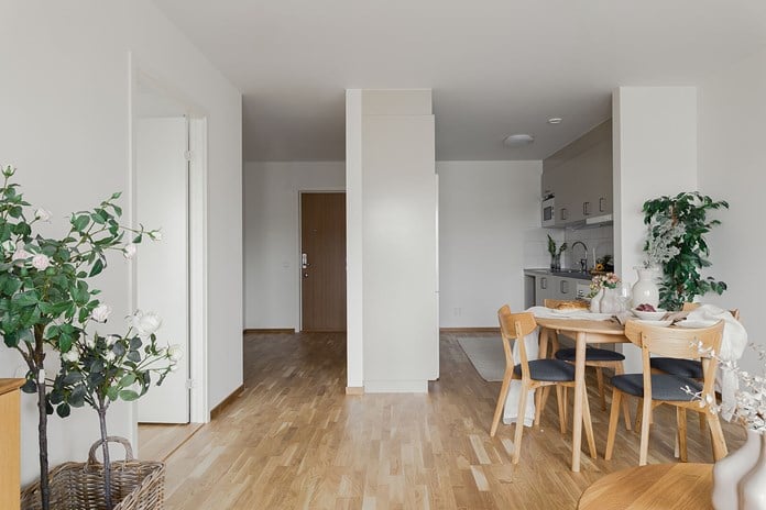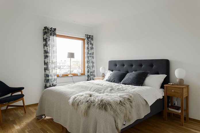 Vardagsrum, kök och sovrum har enhetligt parkettgolv och kökets grundstandard är hög med kyl, frys, spishäll och inbyggnadsugn. Köket har smarta lösningar så som exempelvis kärl för källsortering.