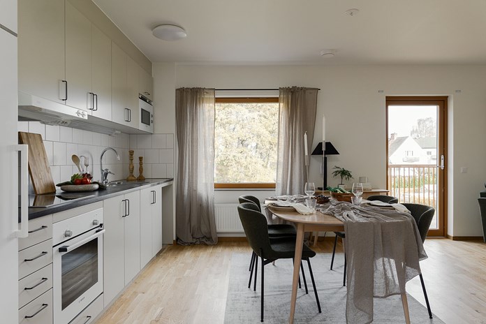 Det kommer att vara tvåor och treor, som passar för 1–2 personer. Alla lägenheter har ordentligt utrustat kök och generöst badrum med tvättmaskin och torktumlare.