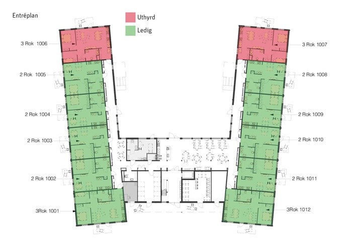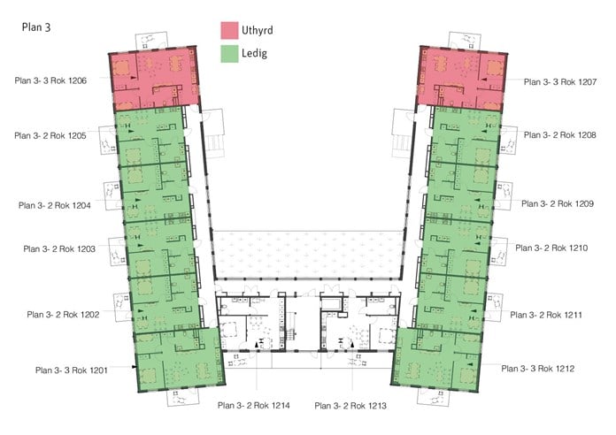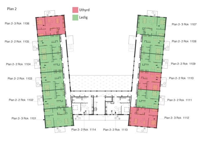 Lägenheterna med tre rum och kök är placerade i gavlarna på flyglarna och är på ca 75 kvadratmeter. Lägenheterna med två rum och kök är placerade mellan treorna i flyglarna och ovanför entrén och är på 55-58 kvadratmeter