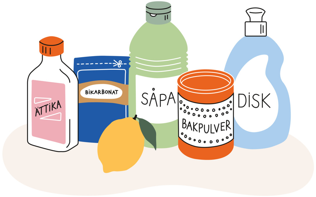 Med miljömärkt såpa och hett vatten kommer du väldigt långt. Du slipper använda skadliga kemikalier. Har du bränt kastrullen? Koka upp vatten med lite såpa alternativt fyll kastrullen med kokande vatten från vattenkokaren och häll i såpa. Låt stå med lock en stund och diska ur. Är ugnen smutsig? Smörj in ugnen med koncentrerad såpa och värm till 100 grader. Låt svalna och tvätta ur med en blöt svamp. Rengör diskbänken med lite koncentrerad såpa. Låt såpan verka en stund och gnugga rent med vatten och en skursvamp och torka av med en disktrasa.