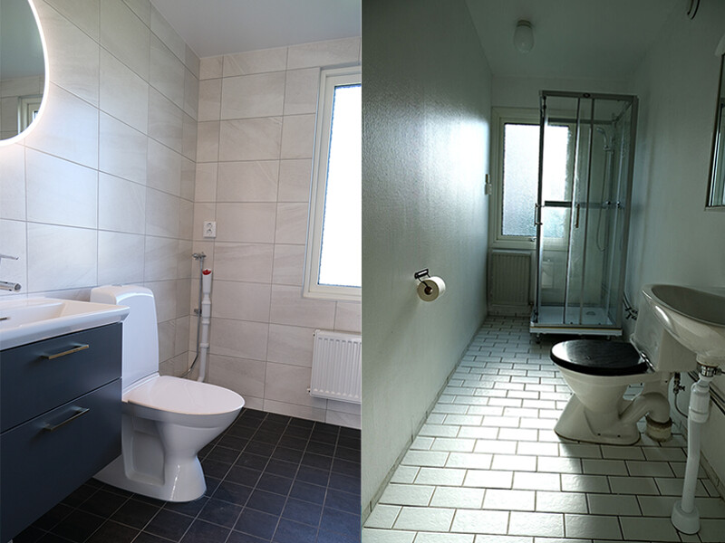 Att få ett nytt fräscht och modernt badrum kan göra stor skillnad i vardagen, här syns ett färdigställt badrum och ett som ännu inte har renoverats.