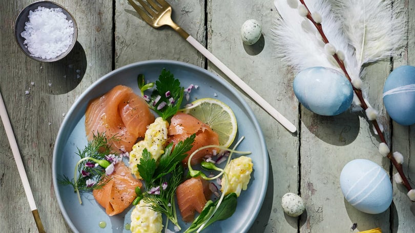Perfekt förrätt att bjuda på till buffén. En krämig äggsallad, kallrökt lax och färska örter.