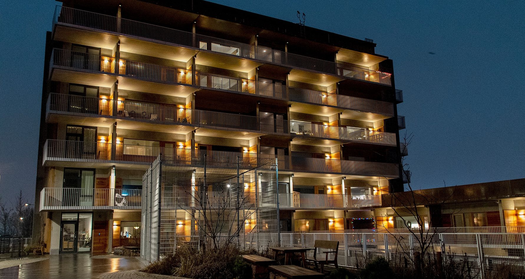 "Brf Viva är ett unikt bostadsprojekt och ett resultat av många års forskning kring att bygga, bo, och leva så hållbart som möjligt. Projektet omfattar 6 hus med 132 lägenheter samt gemensamhetsytor. Arkitekturen och ljusgestaltningen går hand i hand med hållbarhetskraven. Byggnaden känns levande genom sin fasadbelysning med en kombination av balkong- och loftgångsbelysning där armaturerna i loftgångarna dimmas upp och ner vartefter de boende passerar. Innergårdarna har en intressant utformning med gångar rakt på berget och belyses med låga ljusnivåer och rörliga ljusaccenter som är både mysiga och spännande på samma gång. Genomtänkta och kreativa ljusidéer för ökad trygghetskänsla och visuell vägledning har förverkligats genom hela projektet, i gemensamhetslokaler, cykelutrymmen och utegymmet."