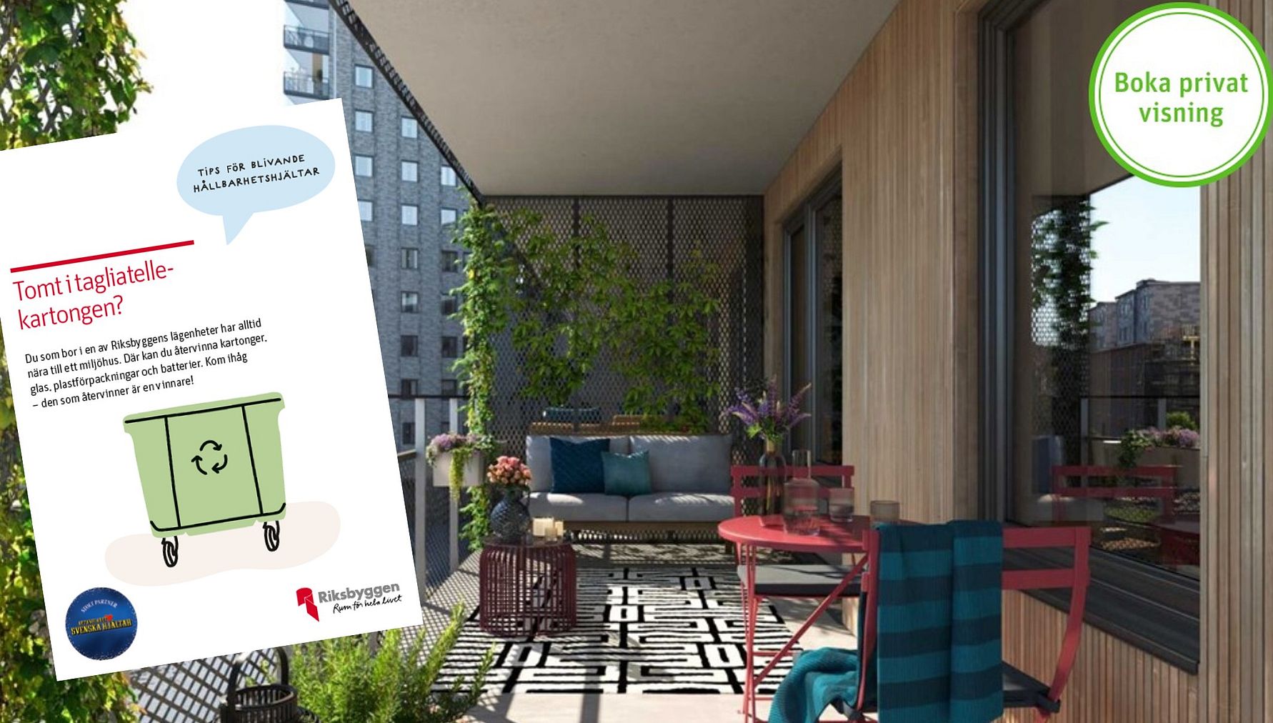 Efterfrågan på nya bostäder är stort och Riksbyggen erbjuder privata visningar i 24 projekt på 18 orter över hela landet. I samband med visningarna kan kunderna leta efter hållbarhetstips och påminns samtidigt om chansen att bli hela Sveriges hållbarhetshjälte. Riksbyggen har ett samarbete med Aftonbladet Svenska hjältar som för första gången i år utser Årets hållbarhetshjälte.